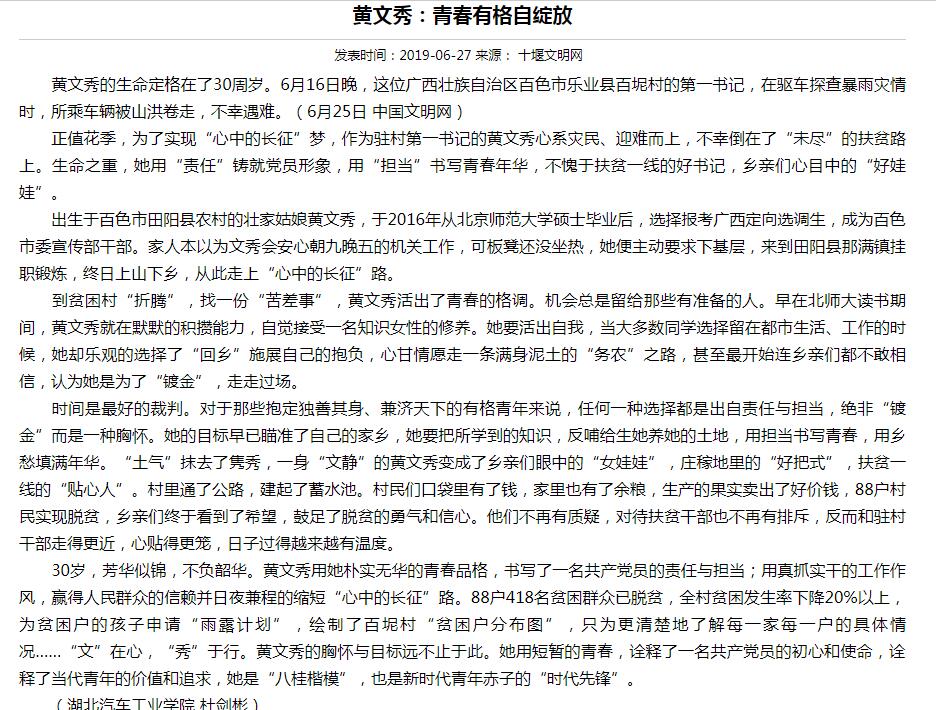 【十堰文明网】黄文秀:青春有格自绽放-国产精品永久久久久久久久久|91精品无码国产在线观看一区|久久人爽爽人爽爽ąV无码自慰|最新无码国模国产在线|2020最新无码国产在线观看